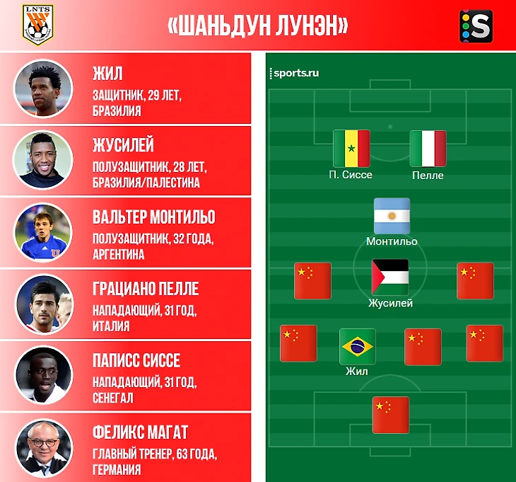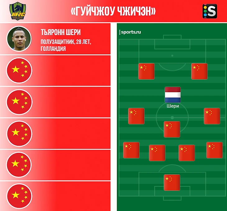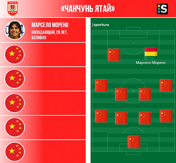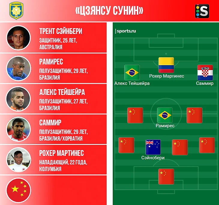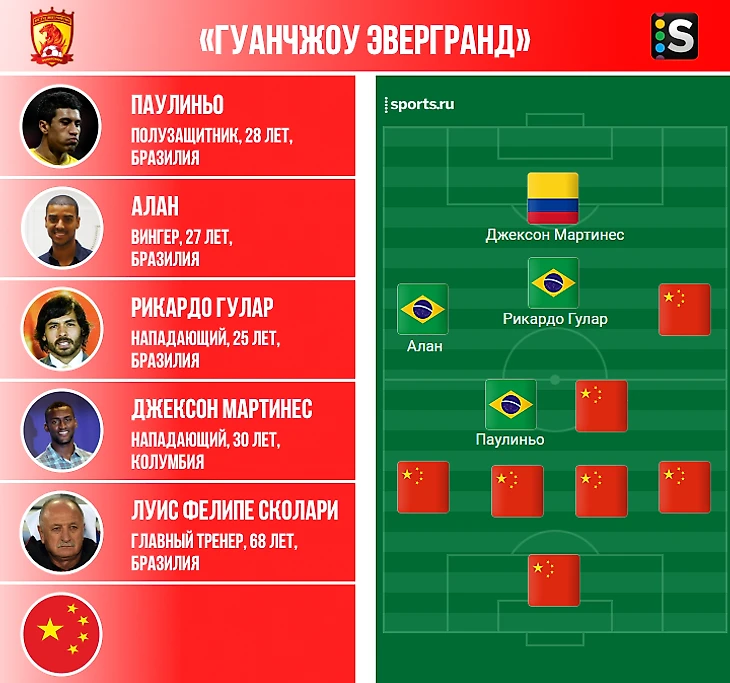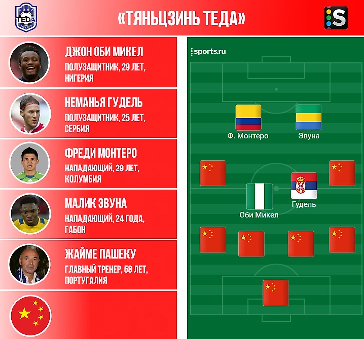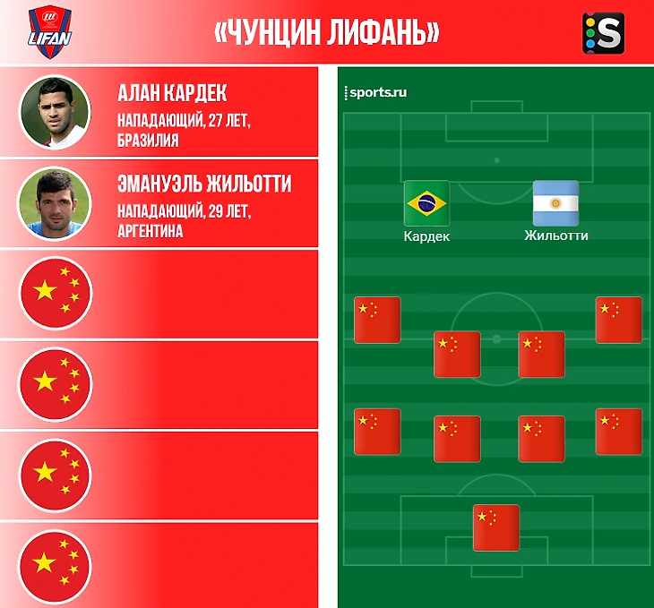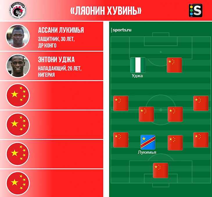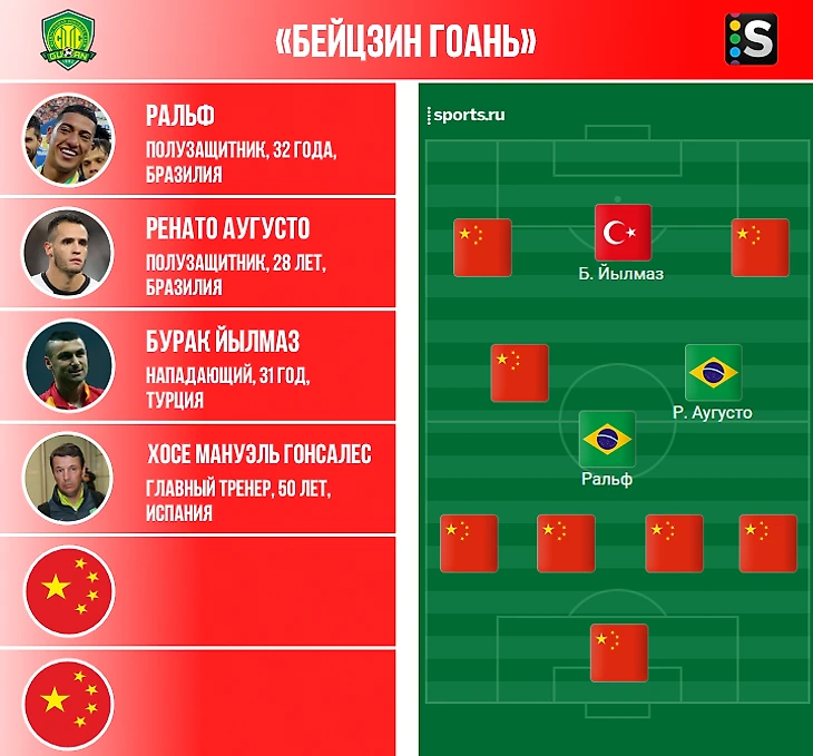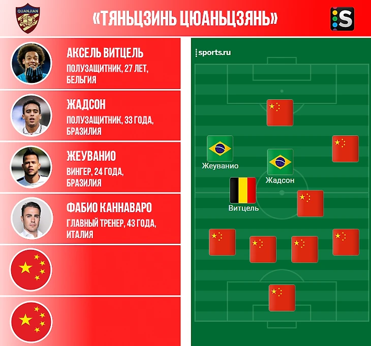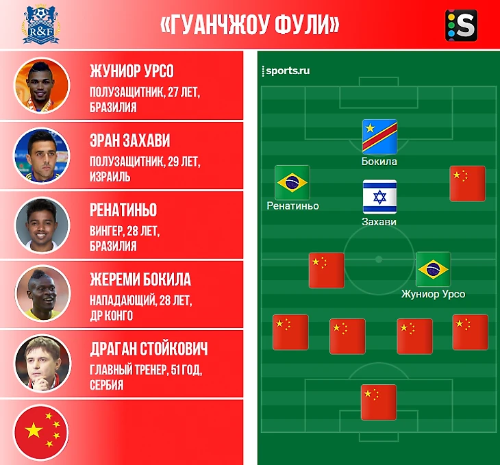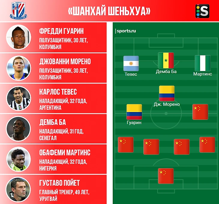 Слева – звездные футболисты и тренеры, а также легионеры, чья трансферная стоимость превышает 1 млн евро, и игроки, засветившиеся в солидных европейских чемпионатах. В Китае действует лимит «4+1» – четыре любых иностранца и один иностранец из азиатской конфедерации могут находиться на поле одновременно. Флагом Китая отмечены вакантные места, которые скоро заполнят новые суперзвезды.