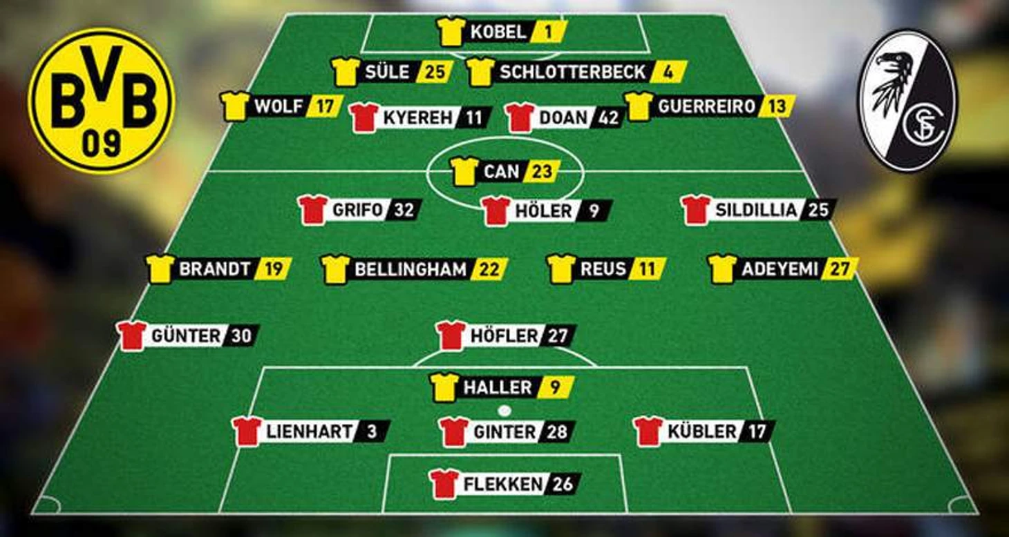 Главный тренер «Боруссии» Эдин Терзич не мог рассчитывать на Юлиана Рюэрсона (приболел) и на Салиха Озджана (дисквалифицирован за 5 желтых карточек), поэтому вместо них на поле вышли Рафаэль Геррейро и Марко Ройс: Грегор Кобель, Мариус Вольф, Нико Шлоттербек, Никлас Зюле, Рафаэль Геррейро, Марко Ройс, Эмре Джан, Джуд Беллингем, Карим Адейеми, Юлиан Брандт и Себастьен Алле. Тактически хозяева играли по схеме 4-3-3 или, если быть точным, 4-1-2-2-1, где Эмре Джан играл на месте единственного опорного полузащитника, а Брандт со своего правого фланга смещался в центр, где часто формировал двойную «десятку» с Ройсом.
