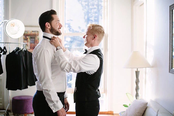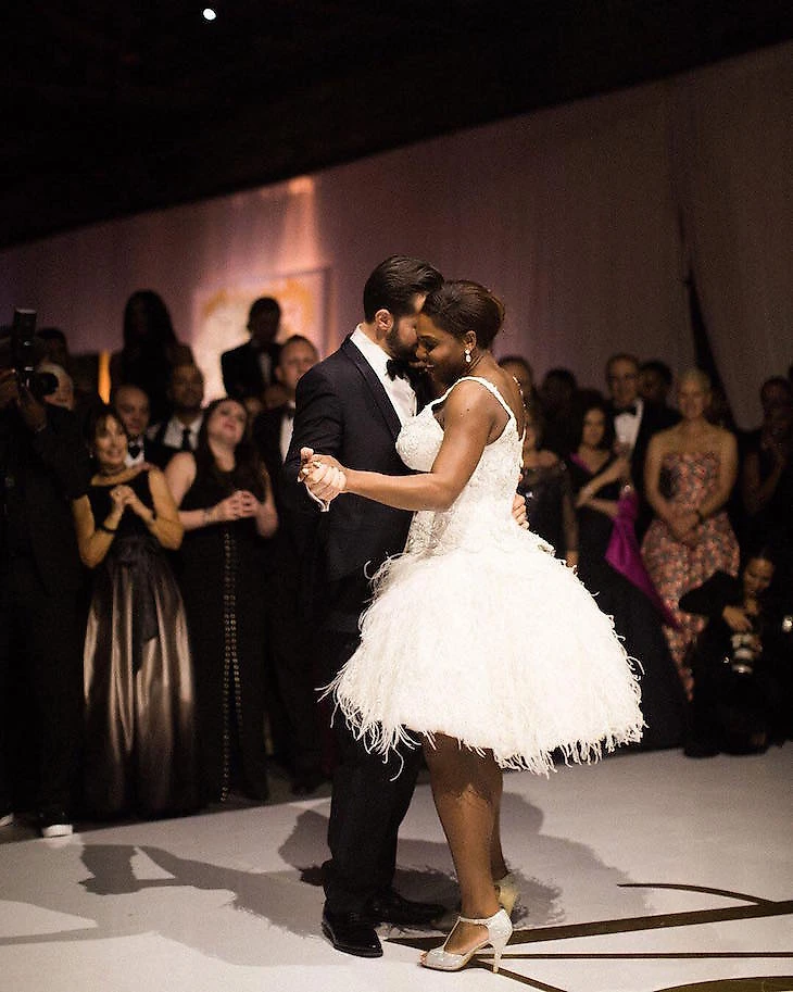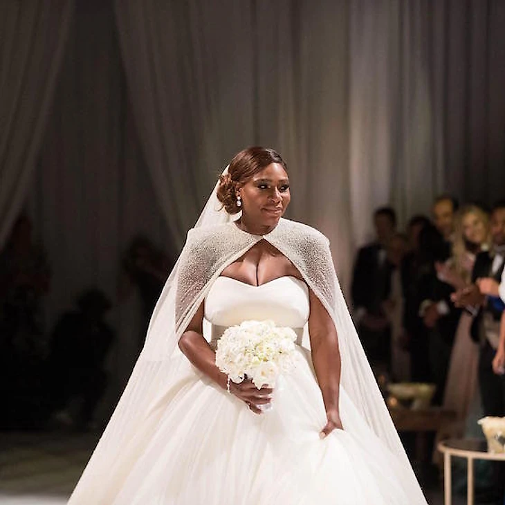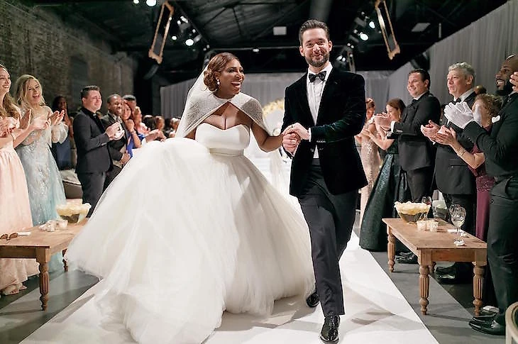 Серена была одета в платье Alexander McQueen, которое позднее сменила на два разных Versace, а также усыпанные стразами кроссовки Nike Cortez, Алексис – в Giorgio Armani. Полный свадебный альбом – у Vogue, которому молодожены продали эксклюзивные права на фото торжества, так что гостям снимать было запрещено.
