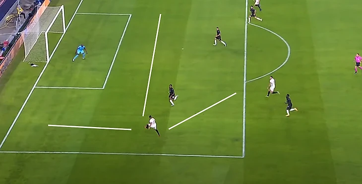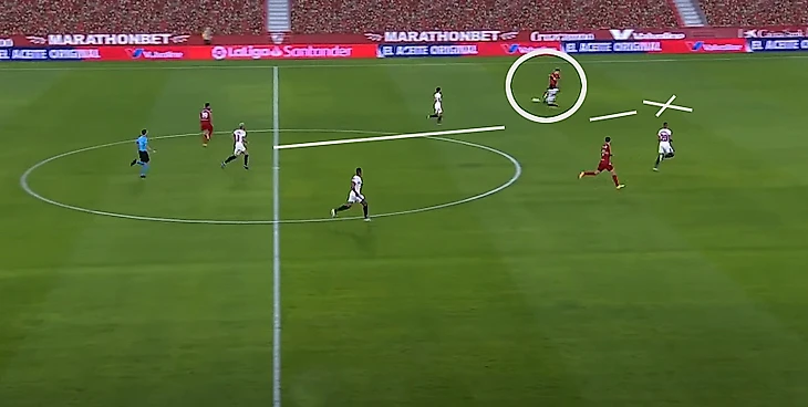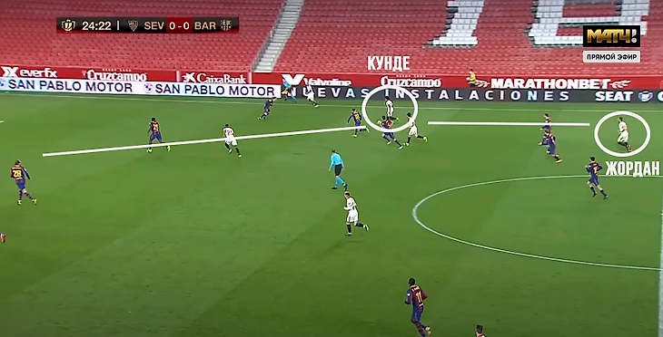 Жюль продвигается с мячом еще дальше, попутно проходя трех игроков соперника. Это дает «Севилье» огромное свободное пространство в штрафной «Барселоны», так как центральный защитник вынужденно выдвинулся на Кунде. В этой атаке Жюль забьет.