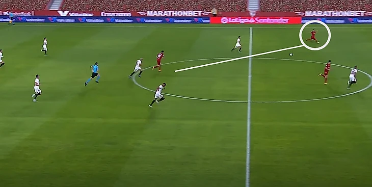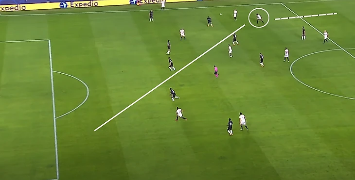 Француз начинает атаку «Севильи» в матче против «Ренна». Кунде замечает забегание Акуньи и продвигает мяч в штрафную соперника, выдавая диагональ в финальную треть поля: