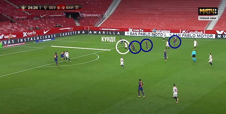Кунде хорошо продвигает мяч. Это дает «Севилье» преимущество в первой фазе атак