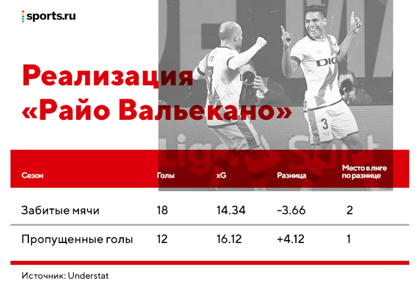 «Райо» и правда сильно не хватает индивидуально хороших игроков. Стиль Ираолы заточен на то, чтобы минимизировать разницу в классе. Главный игрок «Райо» – 33-летний Оскар Трехо: он за 10 матчей набрал восемь баллов по результативности. Это его рекордные показатели, но похоже, что это гипервезение. Та же самая ситуация и с Фалькао.
