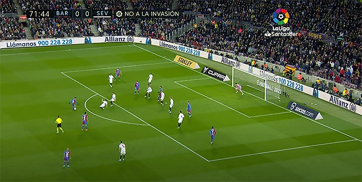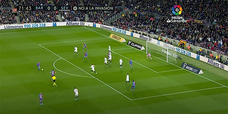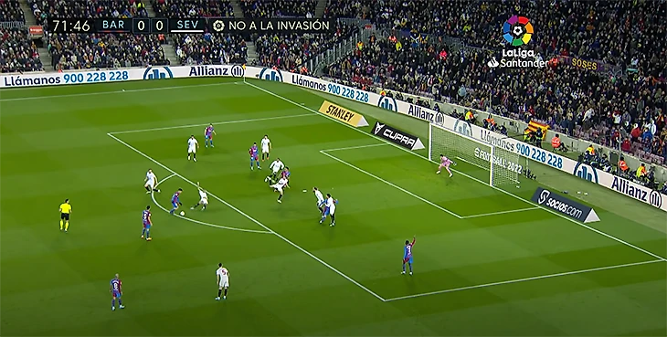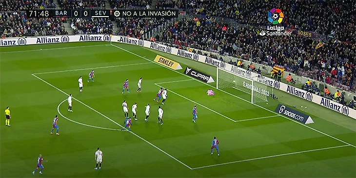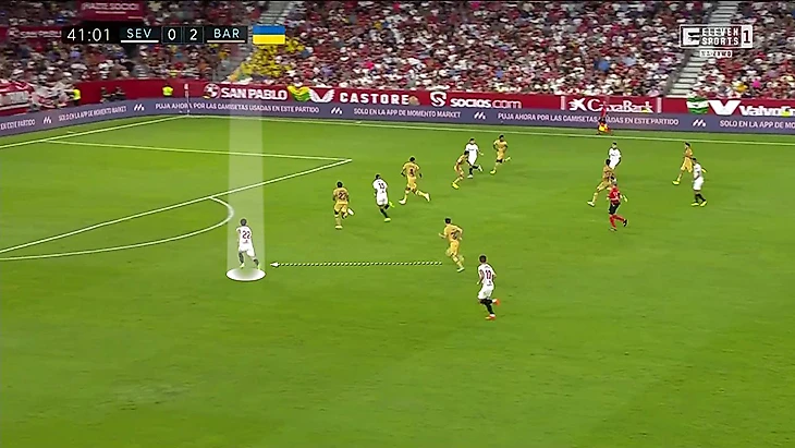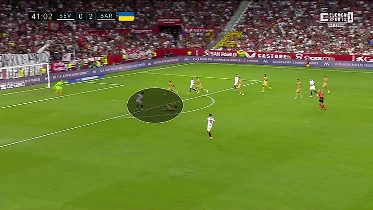 Игра против «Севильи» в начале осени. Гави просто выдвигается со своей позиции и мчит выручать потерявшего позицию партнера, хотя только что прессинговал на чужой половине.