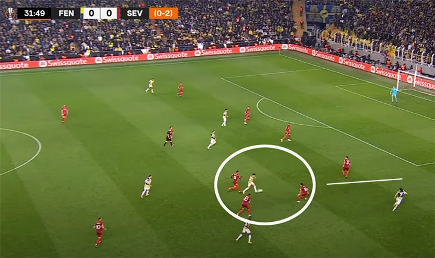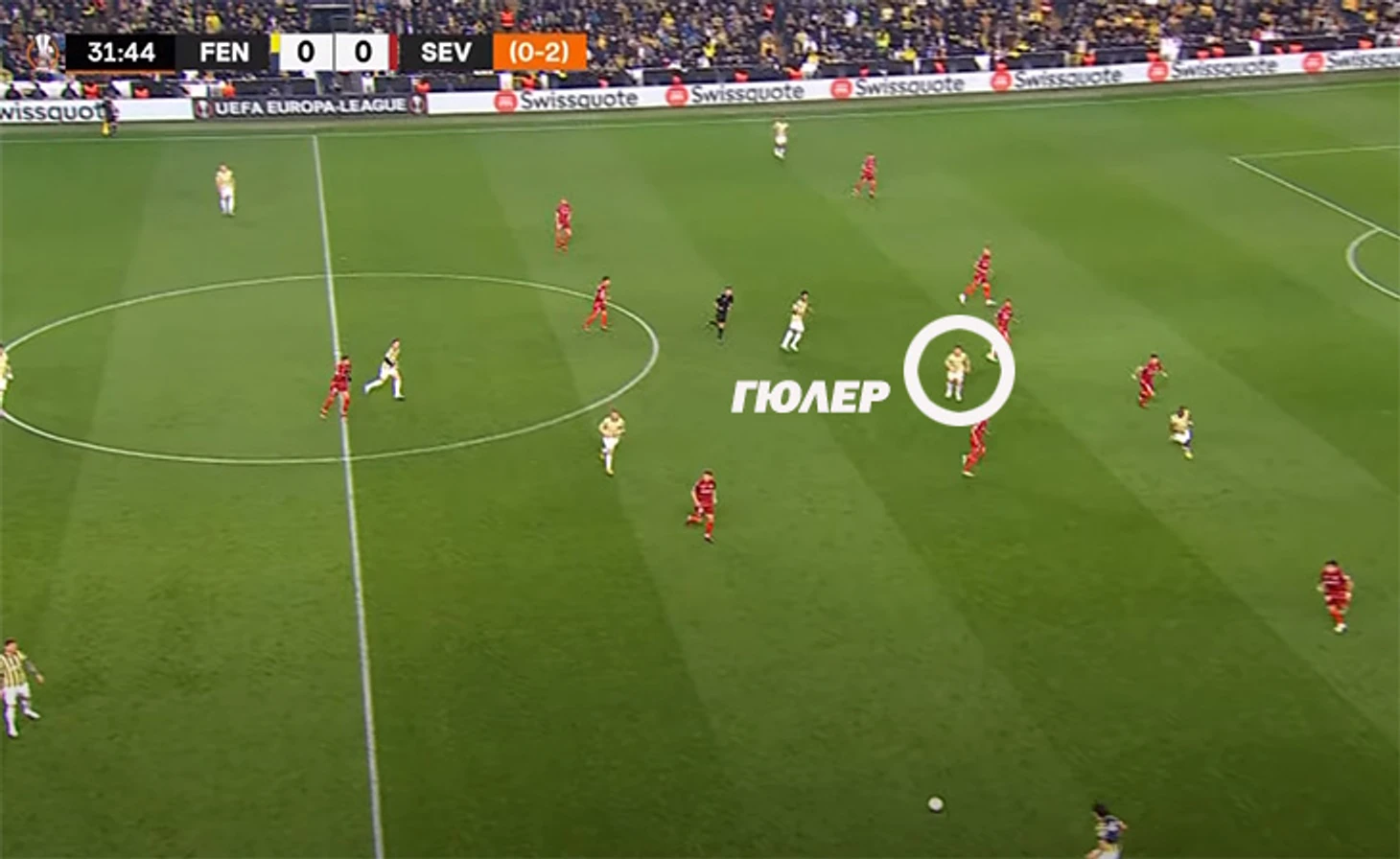 Это не значит, что турок недостаточно умен, просто планка Озила – космос. Арда тоже классно читает игру. Пример из матча с «Севильей» в ЛЕ: игрок сместился из центра и получил за счет этого немного свободного пространства.