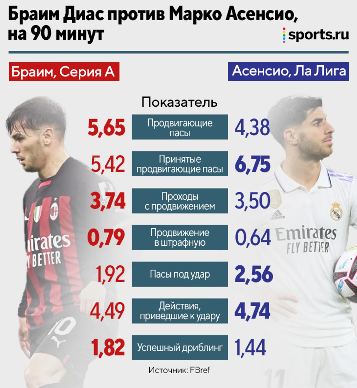 Делаем скидку на разницу в стиле: в Ла Лиге почти все играют низким блоком, тяжелее вскрывать соперника, Асенсио еще и играл на фланге. Показатели схожие, но разный путь к ним: Марко любит создавать остроту с фланга, Браим – десятка. Первый был бы уместнее как игрок ротации в старой схеме, но под новую формацию больше подойдет Диас.