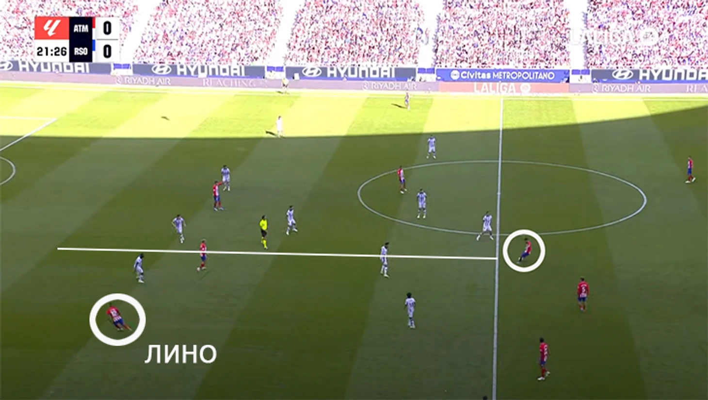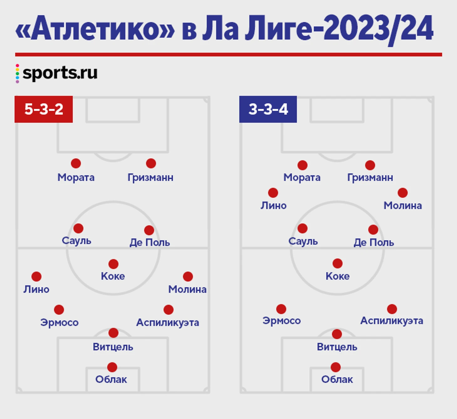 Перед тренером встала интересная загадка. Его ответ – Лино. Это повлекло коренные изменения: если при обороне «Атлетико» все еще использует 5-3-2, то с мячом теперь переходит не на привычные 4-4-2, а на 3-3-4 (в последних играх выходил Сауль, с ним это даже 3-2-5), где Лино и Молина фактически становятся вингерами.