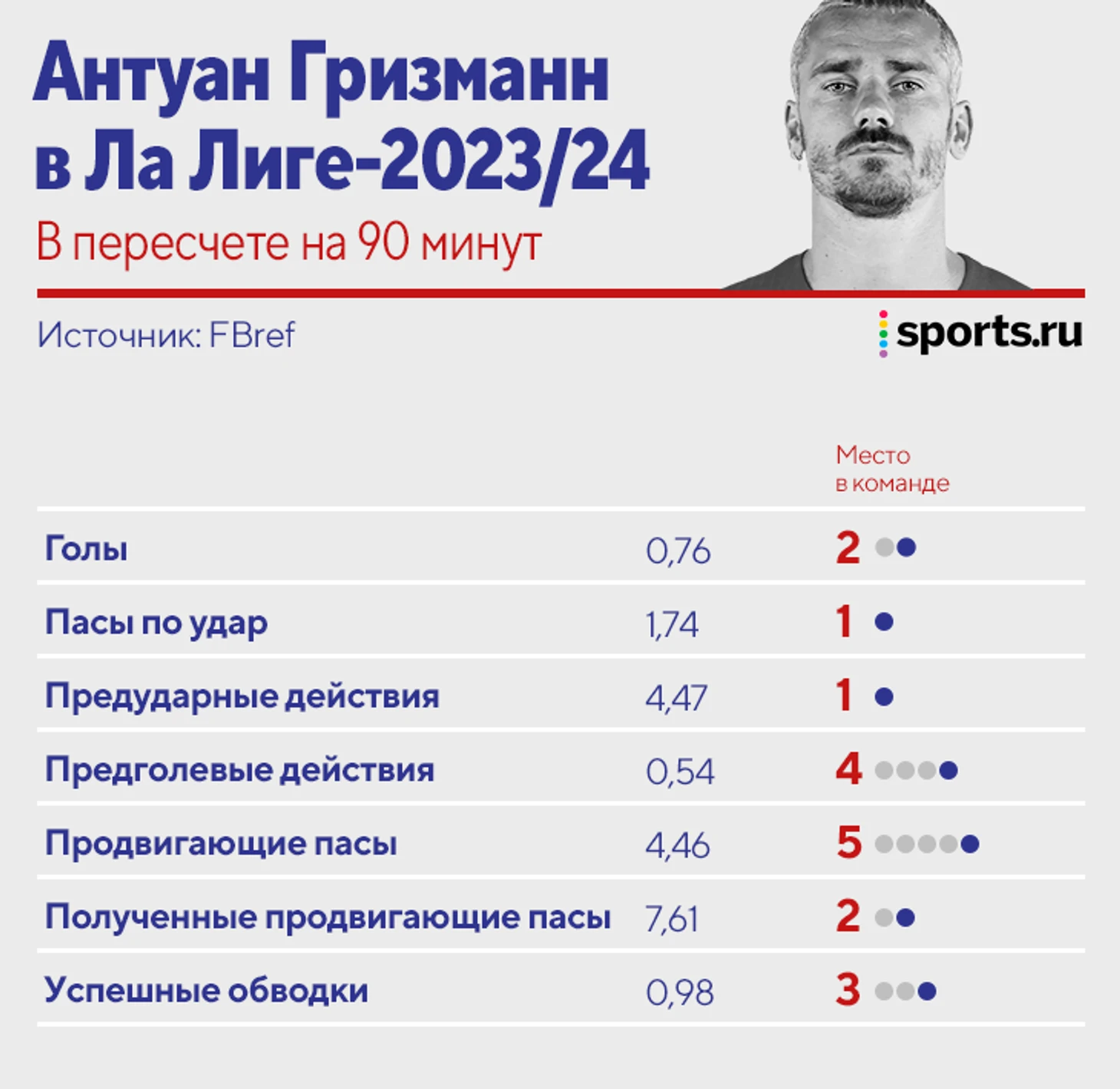 ● Преображение после Катара: гибрид снова начал работать, Чоло выдал три месяца без поражений (шокировали даже Хави, он называл «Атлетико» с отрывом лучшими в Испании), по многим метрикам темп походил на цифры чемпионского сезона. Причин резкого возрождения было много (разбирали здесь), хотя наблюдатели сводили все к форме Антуана Гризманна (справедливо, но слишком поверхностно).