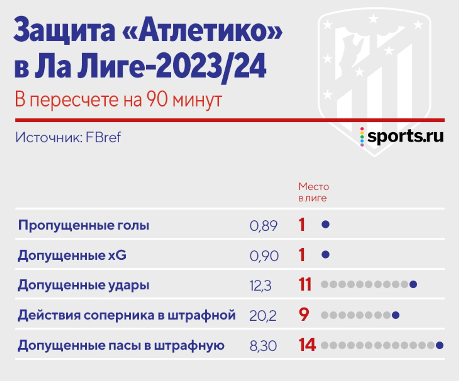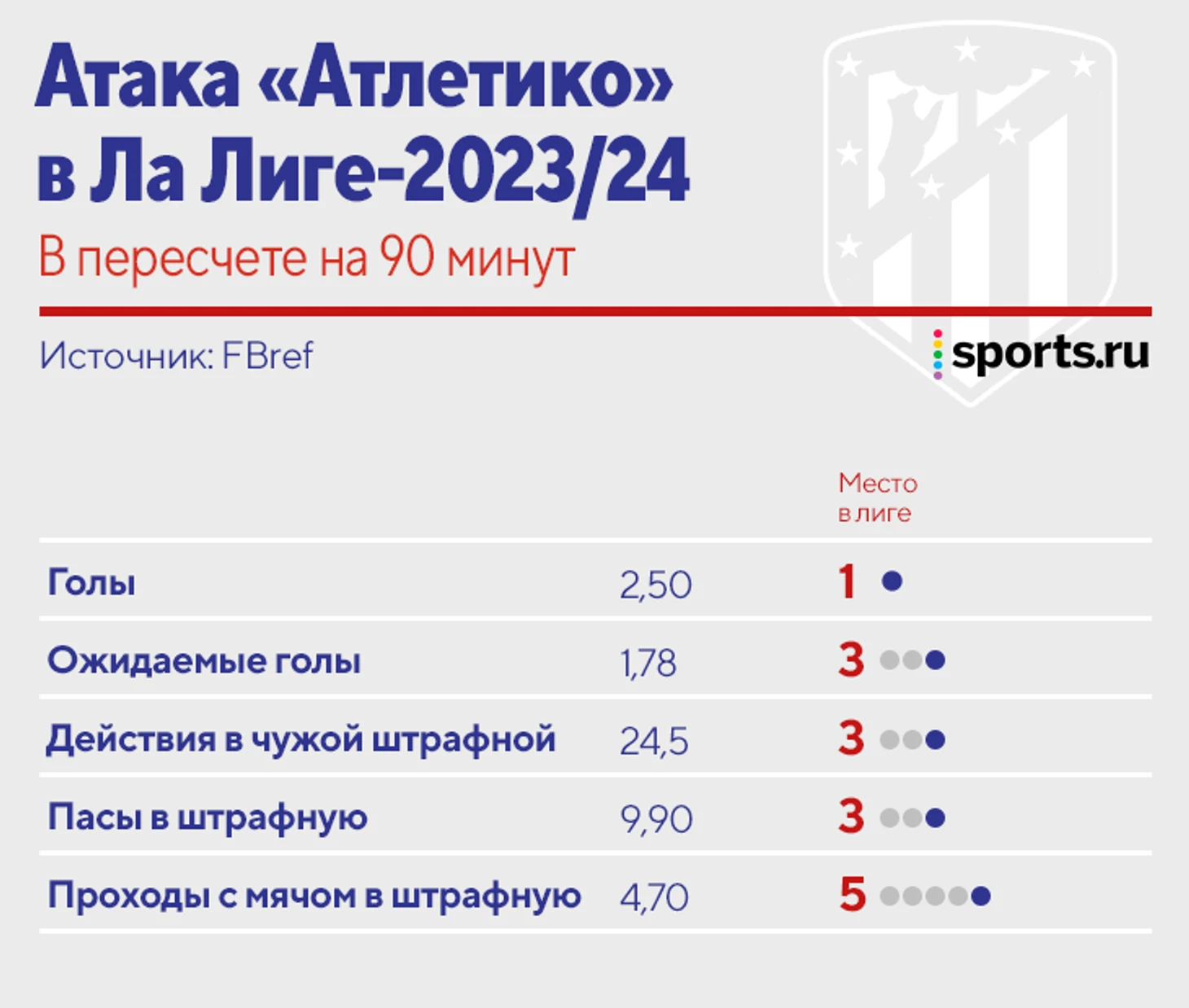 «Атлетико» забивает чаще всех в Ла Лиге, по ожидаемым голам и действиям в чужой штрафной уступает только «Барсе» и «Мадриду». Симеоне долго шел к таким цифрам.