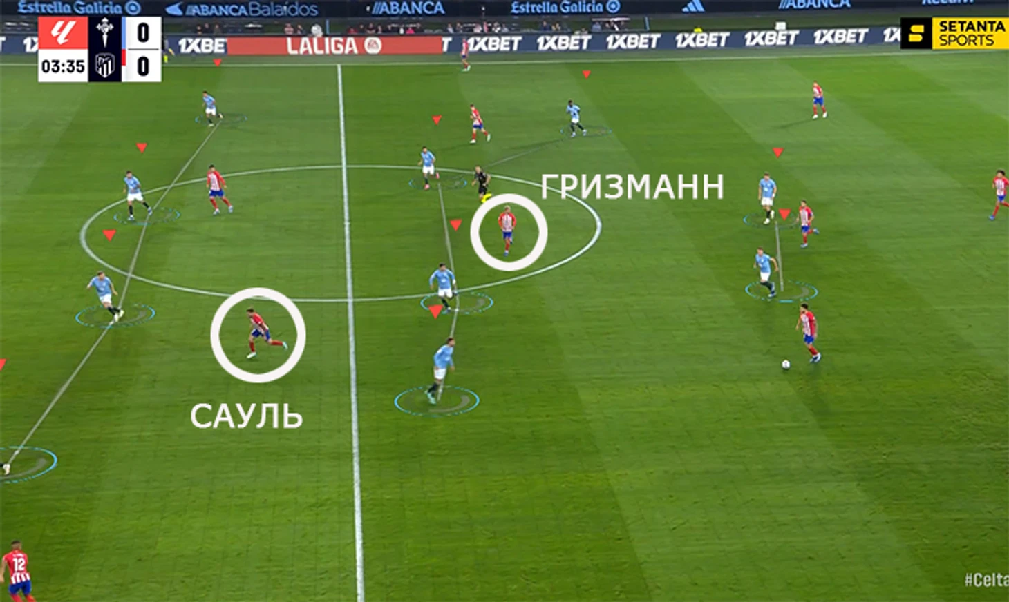 Последим за движениями Гризманна в игре с «Сельтой». Начинает матч номинальным левым форвардом, но когда Сауль поднимается, остается в центре – и атакует вторым темпом.