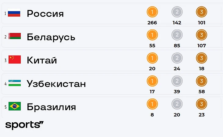 Очевидно, что безумное количество наград – прямое следствие уровня конкуренции. У финишировавших вторыми белорусов побед почти в пять раз меньше, чем у нас (55 против 266), а китайцы победили всего 20 раз и забрали каких-то 62 награды.