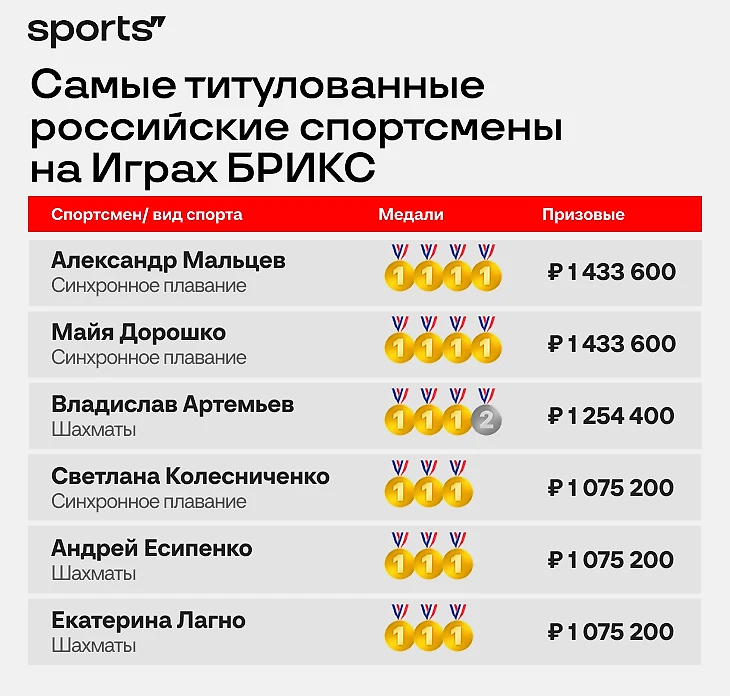 Например, в синхронном плавании на Играх БРИКС разыгрывалось сразу 11 медалей. Для сравнения на Олимпиаде – всего две. Александр Мальцев взял 4 награды, пусть и не всегда ему находились соперники, и заработал почти 1,5 млн рублей.