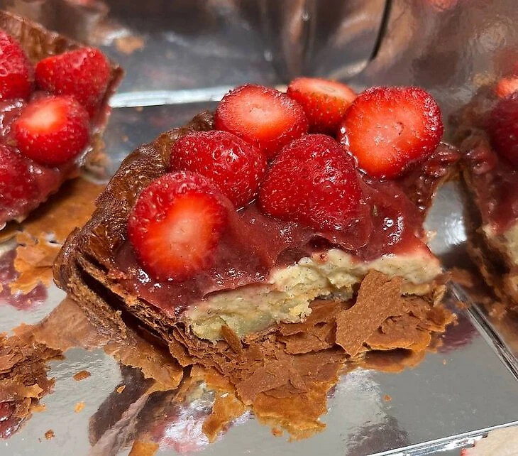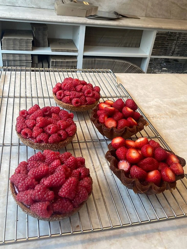 Нам рассказали, что поверх теста (оно такое же, как у круассанов) в корзинке – нежнейший миндальный крем, ваниль, клубничный джем и, наконец, свежие ягоды. Секрет в том, что каждый из ингредиентов идеален. Стоит сэкономить на чем-то – и волшебства не получится.