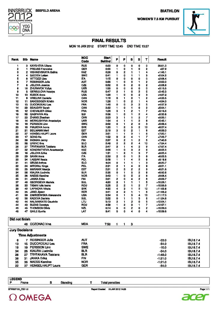 Далее давайте посмотрим на итоговый протокол женской гонки преследования с юношеских Олимпийских игр 2012 года: