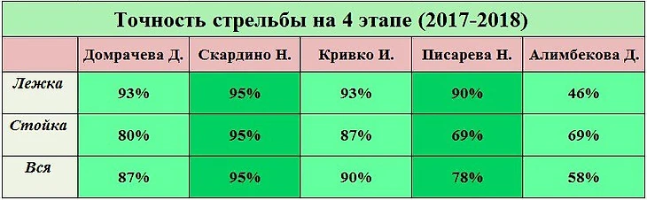 Самой успешной на этом этапе в белорусской сборной стала Дарья Домрачева, которая в спринте и гонке преследовании заняла соответственно 7 и 6 места. Даша была недостаточно точна и быстра на стрельбище, что и лишила ее медалей. А вот скоростью и красотой летящего лыжного хода порадовала. Как и бойцовским характером, продолжая борьбу с Лаурой Дальмайер до самых последних сантиметров дистанции и выиграв ее.
