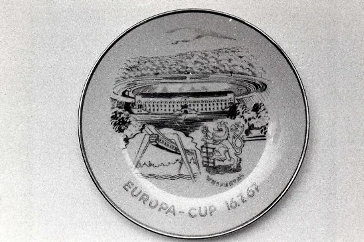 Памятная тарелка с изображением Stadion am Zoo, монорельса, герба города и зелеными холмами Вупперталя. 1967 год.