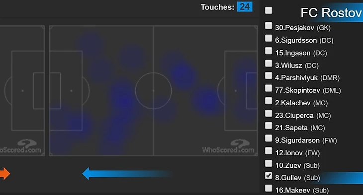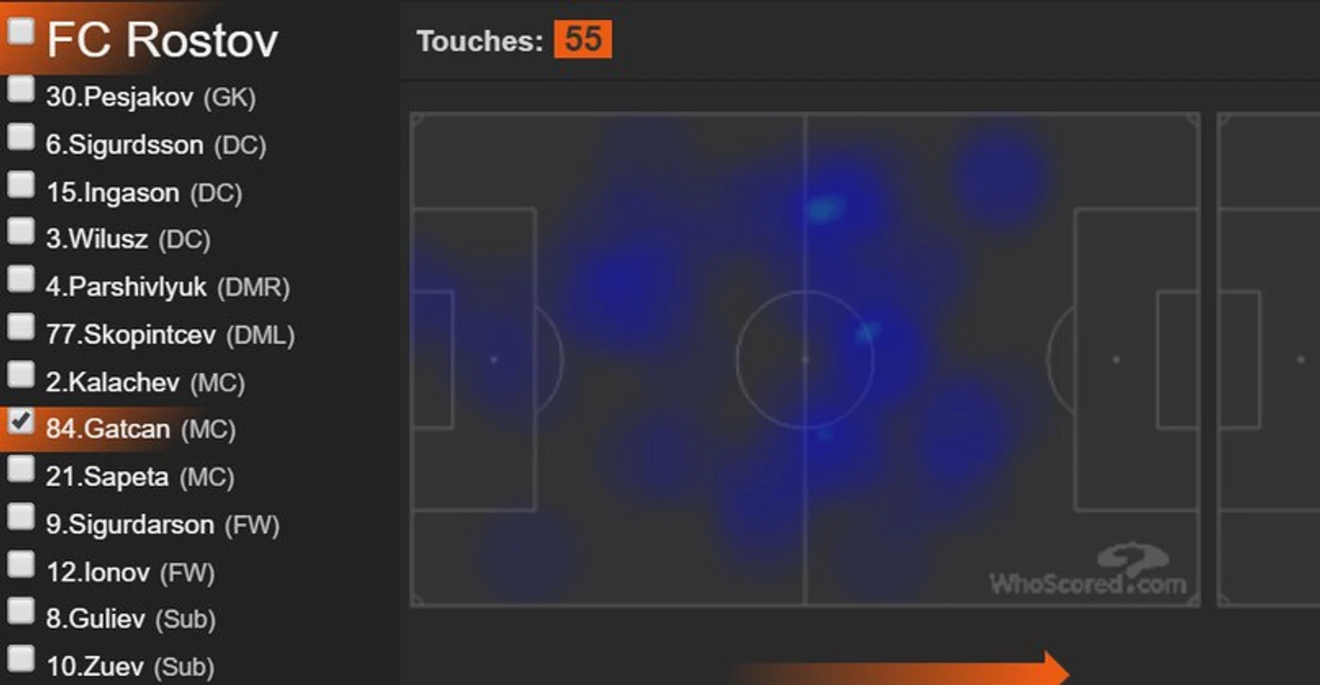 Изначально нужно сказать о том, что футболист вышел на позицию Гацкана, которую он занимал в матче против «Зенита». Естественно, игрок должен был восполнить все те функции, которые ложились на его соотечественника в прошлом матче, но, увы, он их выполнял только по движению на поле. К слову, это еще раз подчеркивает, что при Карпине даже футболист резерва понимает куда и как двигаться.
