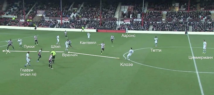 На этом скрине Трибулл (опорный полузащитник), встраивает себя в линию обороны, чтобы помогать разогнать мяч. Этим Норманн занимался несколько лет в «Ростове».