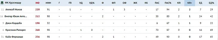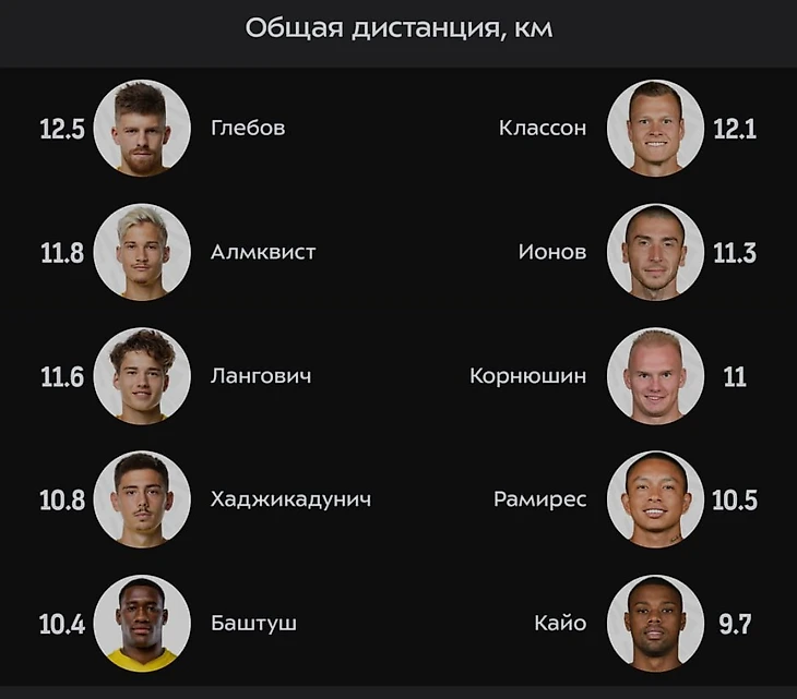 Первая пятерка по дистанции полностью перебегала пятерку "Краснодара". Глебов отбегал 12,5км, что крайне солидно по меркам Европейских Чемпионатов. Отмечу, что Лангович вошел в тройку по пробегу.