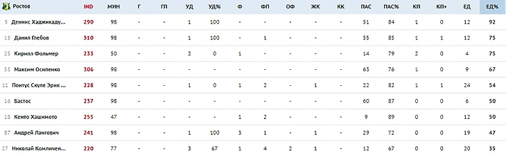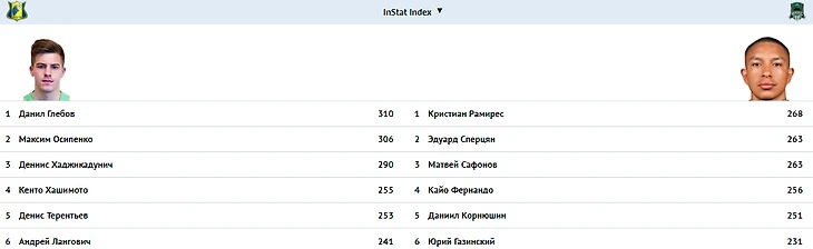 Лучшими игроками матча по данным instat стали Глебов и Осипенко. Скажу, что первый уже третий матч подряд становится лучшим в составе "Ростова". Новоиспеченный дебютант сборной тоже проводит стабильный сезон, и оказывает постоянное сопротивление Глебову в списке лучших.