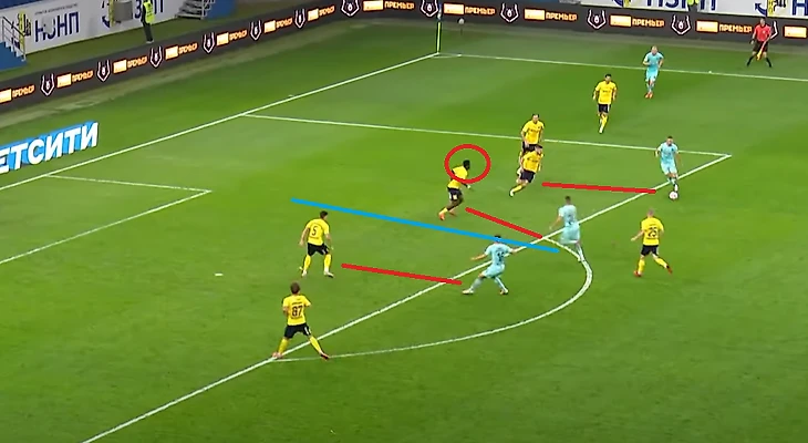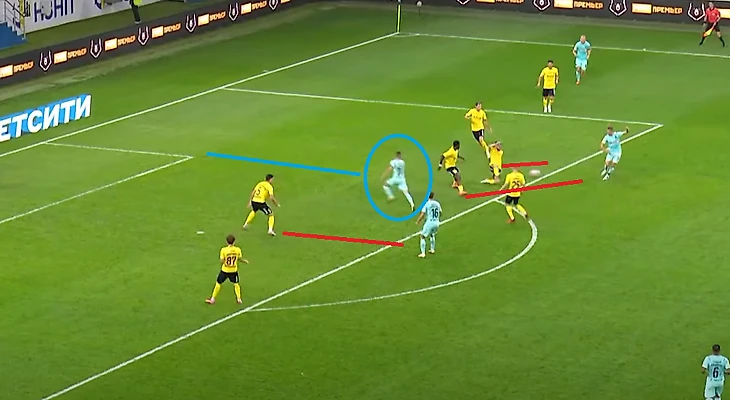 На первом скрине видно, что, Баштуш, во-первых, не видит своего игрока (смотрим на его голову), который забегает в его зону.