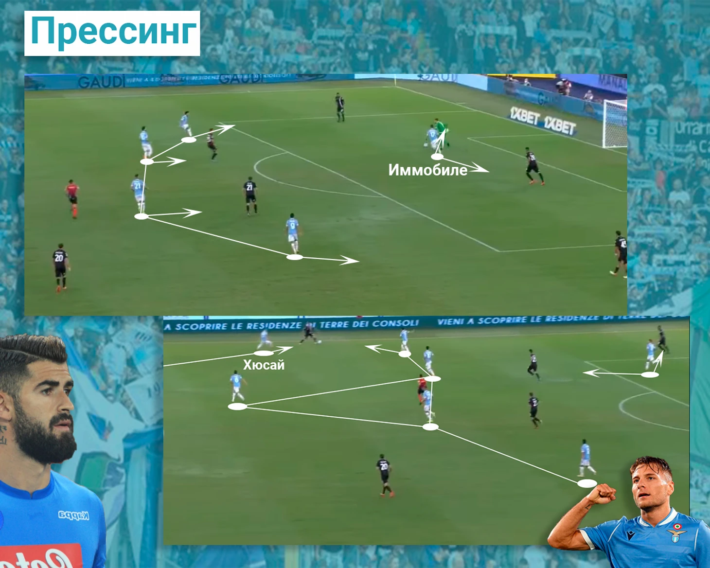В отличие от игры в первой стадии атаки, Хюсай и Марушич должны были высоко подниматься по бровке, чтобы прессинг-ловушка сработала. Прессинг-план Лацио строился на схеме 4-3-3 (4-1-4-1), главным его двигателем был Чиро Иммобиле, именно он выбирал в какой фланг загонять мяч. На скриншоте видно, как Чиро горизонтальным движением направлял мяч к бровке, где ловушка схлопывалась, когда вингер (Андерсон) и КЗ (Хюсай) вдвоем прессинговали игрока Специи. Подводя итог, можно сказать, что у Лацио довольно неплохо получается адаптироваться к системе Сарри. Да, ещё сыграно мало матчей, но уже видны многие принципы Сарри и фишки, которые делают команду непохожими на предыдущие творения Маурицио. Щипотку отлаженного контрпрессинга и эта команда уже точно претендент на борьбу за скудетто.