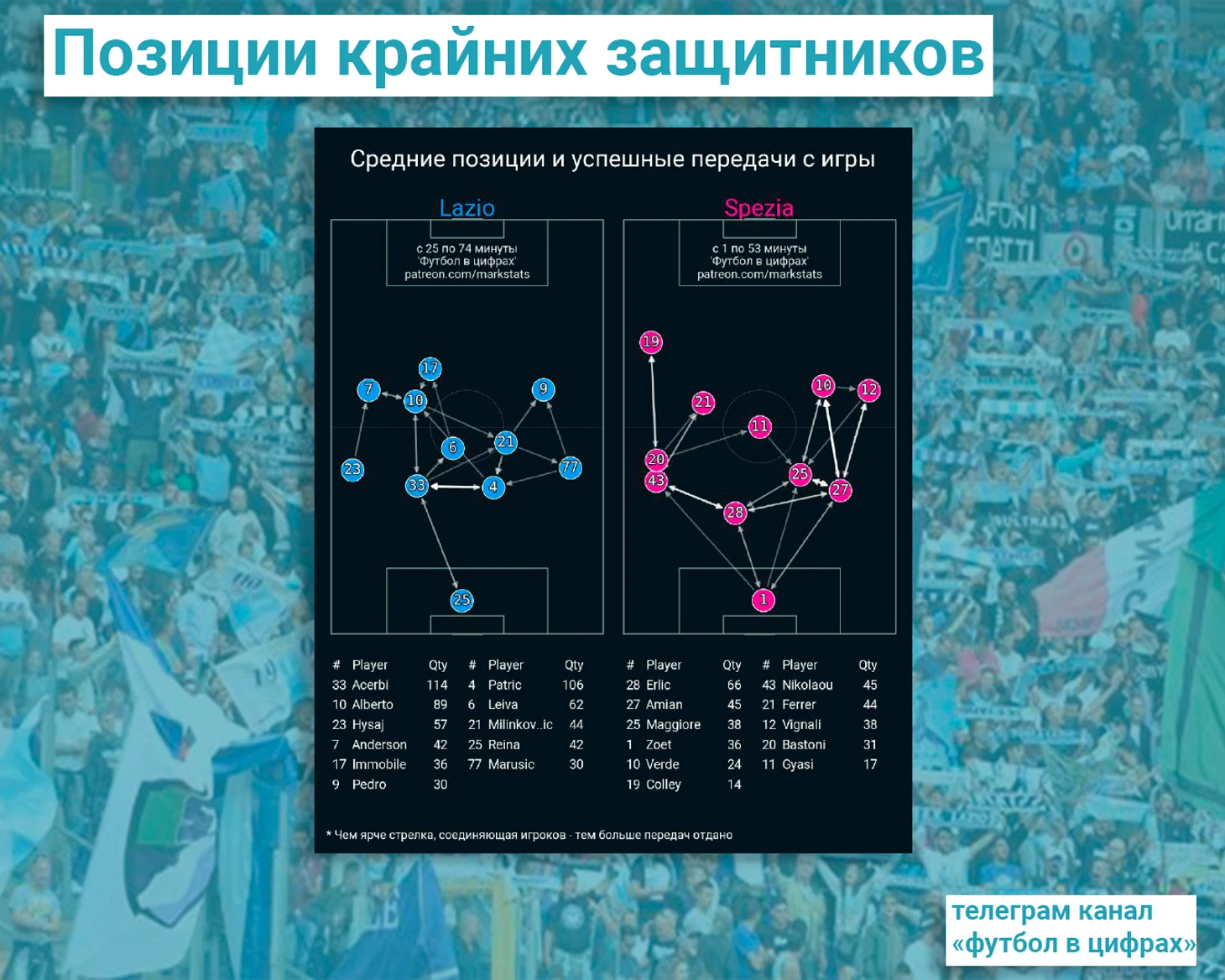 те же треугольники, но вот опорник уже новый - Лукас Лейва, далеко до Жоржиньо, но пока не плохо. Вообще, философия Сарри предполагает высокую позицию крайних защитников, но против Специи, которая играла с тремя нападающими и в персональный прессинг (про прессинг позже), позиция Хюсая и Марушича были видоизменена. Это видно по усредненным позициям игроков: