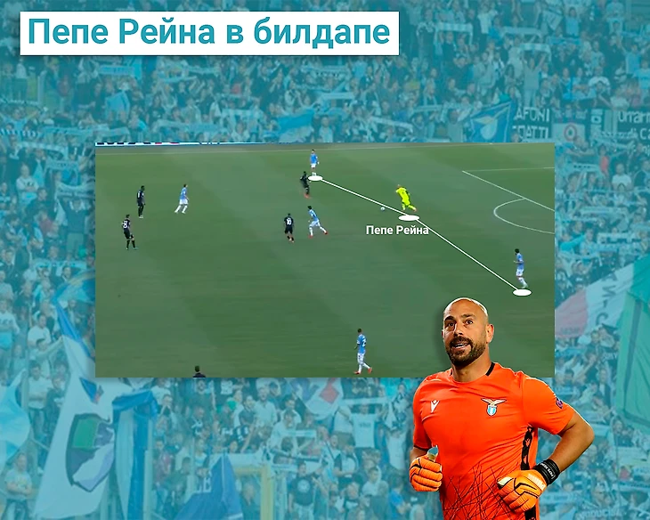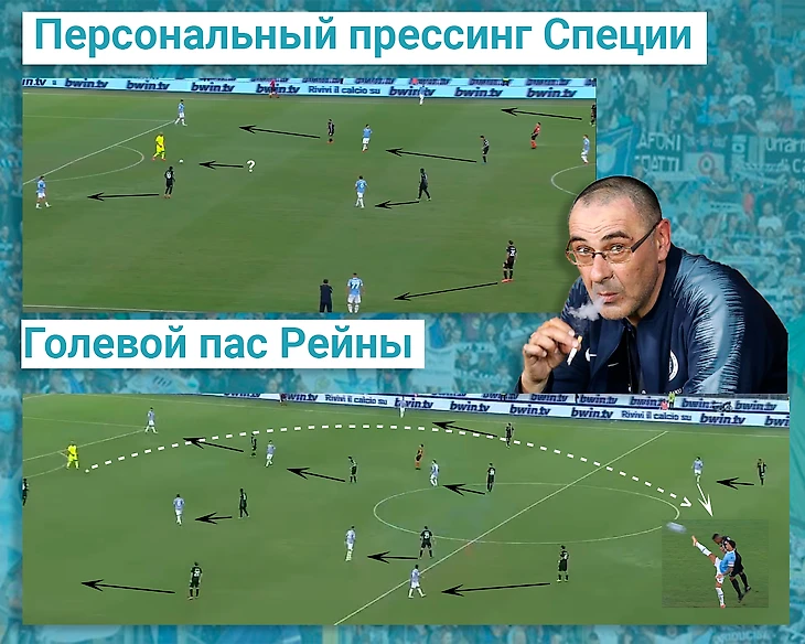 Такая роль вратаря ставила в ступор игроков Специи, они не знали кто и когда должен прессинговать Пепе. Рейна пользовался временем, которое ему выносили на подносе подопечные Тьяго Мотты (гл. тренер Специи), и снабжал подготовленными передачами Андерсона. Именно таким образом испанский голкипер отдал голевую передачу, правда были намеки на опасную игру со стороны Андерсона (выделил на скриншоте). Ещё немного про крайних защитников и прессинг Лацио...