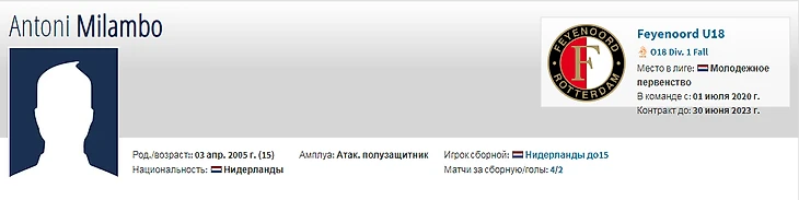 Уже третий игрок в нашем топе представляет Фейеноорд, и это ещё не предел. Плюс не забываем про Аппия, который совсем недавно со скандалом покинул данный клуб. Фейеноорд действительно собрал сейчас очень яркое поколение игроков. Миламбо уже в свои 15 лет выступает за команду U-18. Вот, что игрок говорит про себя - "Физически мне еще нужно расти, я еженедельно играю с мальчиками, которые все старше. Но это хороший опыт обучения, и он мне нужен, чтобы попасть туда, где я когда-либо хочу быть". Игроком очень сильно интересовался Манчестер Юнайтед, но он решил, что нужно пока остаться здесь.