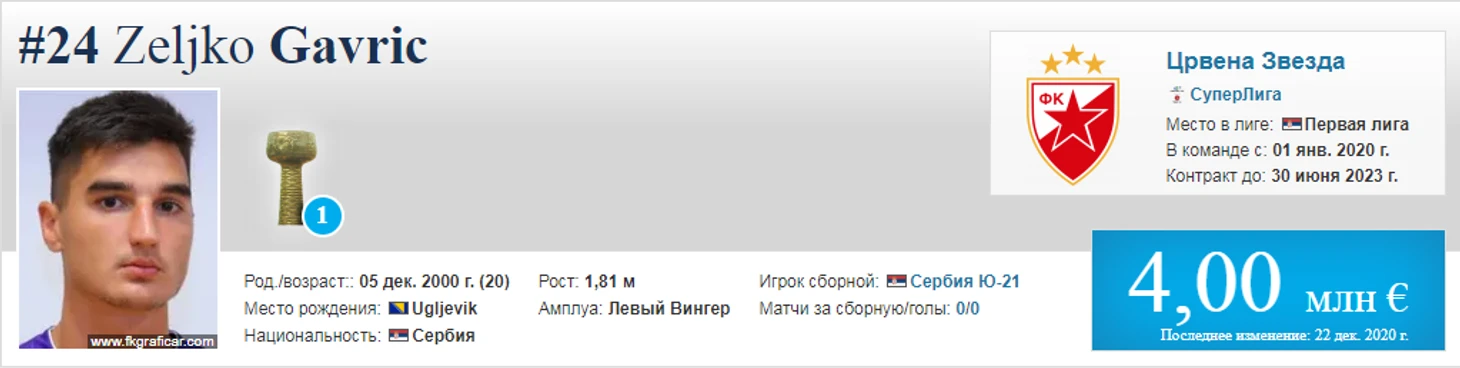 На второе место я поставлю Желько Гаврича, который в этом сезоне выглядит очень солидно в составе сильнейшей команды Сербии, в 14 играх отличился 4 раза. Да, его нельзя назвать железным игроком основы Црвены Звезды, но нужно понимать, что и уровень конкуренции за место в составе очень высокий. Вызывался в сборные Сербии U-18 и U-19. Является полностью своим для клуба, так как он её воспитанник. Сайт transfermarkt оценивает игрока в 4.000.000 евро и это вторая стоимость в клубе (выше только Филиппо Фалько) и третья стоимость среди всех футболистов сербской лиги. Из сильных качеств выделим технику, дриблинг, скорость, быстроту принятие решений и удары.