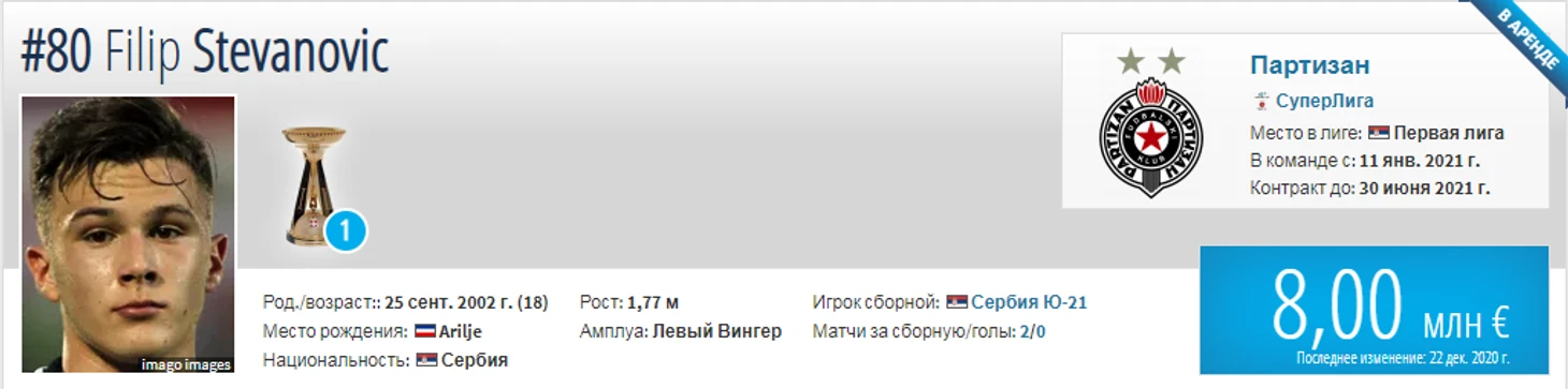 На первое место я поставлю самого дорогого (8.000.000 евро) футболиста всей сербской лиги. Тем более понимая, что ему всего 18 лет и ему есть куда расти. Парня выкупил Манчестер Сити за 8.500.000 евро и оставил до лета 2021 в аренде в Партизане. Игрок является просто огромным талантом всей Сербии. Отмечаем, что он уже провёл за основу Партизана 60 матчей. The Guardian составлял традиционный список из 60 главных футбольных талантов своего поколения. В топ парней 2002 года рождения вошел и Филип Стеванович. Поговаривают, что после публикации этого списка фонд Пини Захави предлагал за Стевановича 21 млн. евро. Из сильных качеств игрока отметим технику, дриблинг, скорость, дальние удары, командная работа, быстрота принятия решений и концентрацию.