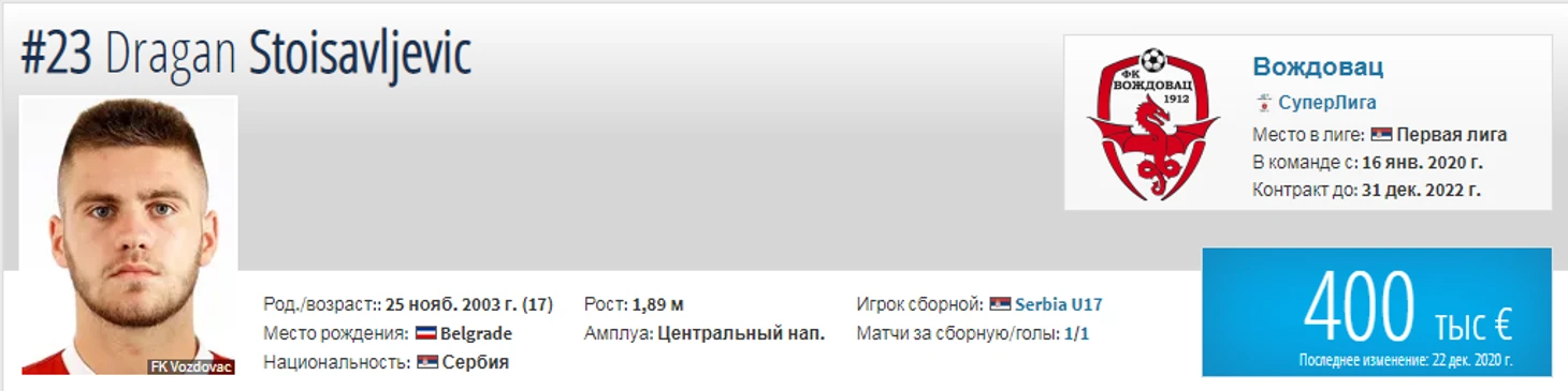 Драгану только в ноябре 2020 года исполнилось 17 лет, а у него уже есть 30 матчей и 5 мячей за клуб Вождовац. Да, в старте игрок появляется не часто, но это и понятно, учитывая его возраст. Но, его талант виден и ему стараются давать игровые минуты на поле. В небольшом клубе явно рассчитывают, что футболист сможет себя проявить, и в последствии перейти в более сильный клуб. Из сильных качеств выделим физические данные, игру головой при росте 1,89 и завершение.