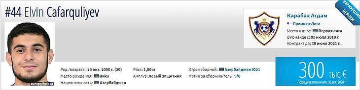 На первое место поставим левого защитника из сильного Карабаха. Так, как он играет достаточно много в сильном клубе, то я поставлю его так высоко. Плюс он вызывается и достаточно много играет в форме молодёжной сборной Азербайджана. Уже у него набралось 10 матчей за сборную U-21. Также не стоить забывать, что у него есть еврокубковый опыт, так как он 7 матчей за Карабах в Европе.
