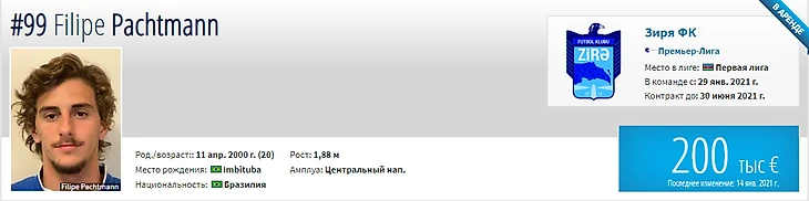 Трансферные права на Филипе принадлежат украинскому клубу Львов, но зимой его отдали в аренду в клуб Зиря до лета 2021 года. Он успел уже провести три матча в новом для себя клубе. По позиции на поле он является центральным нападающим. Так, как в чемпионате Азербайджана не очень большой выбор среди молодых футболистов и поэтому Фелипе попал в наш список топ-5. Из качеств отметим технику, дриблинг, настырность и решительность при действиях с мячом.