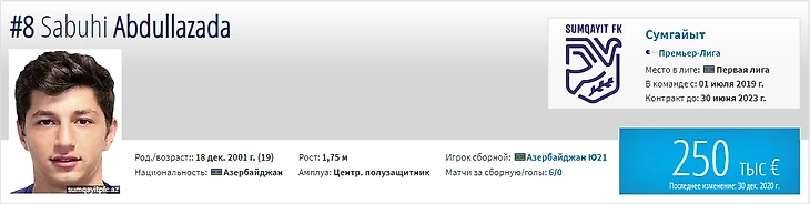 Парень дебютировал за основную команду своего клуба в очень юном возрасте 15 лет и 11 месяцев. Да, к своим 19 годам он наиграл всего 23 матча за клуб, но думаю он может ещё себя проявить. Плюс он мало играя за свой клуб, стабильно вызывается в молодёжную сборную Азербайджана. Из сильных его сторон отметим видение поля и быстроту принятия решений на нём.