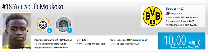 На первом месте у нас парень под которого Бундеслига переписывала свои законы. Парень обладает просто невероятным талантом и потенциалом к росту. Да, многие могут усомниться в достоверности его возрастных данных из-за его африканских корней, но я думаю не стоить этого делать. На юношеском уровне Мукоко просто разрывал своей статистикой. В апреле 2019-го, когда парню было 14 лет, с ним уже подписал долгосрочный спонсорский контракт Nike – на 10 млн евро (общая сумма, не в год). Мукоко самый молодой дебютант за всю историю таких турниров, как Бундеслига (16 лет 1 день) и Лига чемпионов (16 лет 18 дней).