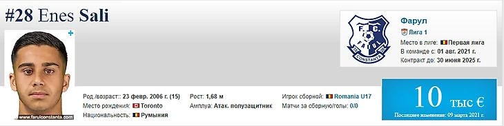 В нашем посте уже были и мексиканский Месси (№9), и шведский Месси (№5), но выше их и талантливее я поставлю румынского Месси из клуба Фарул. Уроженец Торонто (Канада). В 2017 году стал игроком футбольной академии испанской Барселоны, где провёл два сезона, но из-за сложностей со стороны ФИФА был отпущен клубом. 9 августа 2021 года Сали дебютировал в основном составе Фарула в матче румынской Лиги I против Сепси. 13 сентября 2021 года Энес забил свой первый гол за Фарул в матче румынской Лиги I в возрасте 15 лет, 6 месяцев и 21 дня став самым молодым автором гола в истории румынского чемпионата.