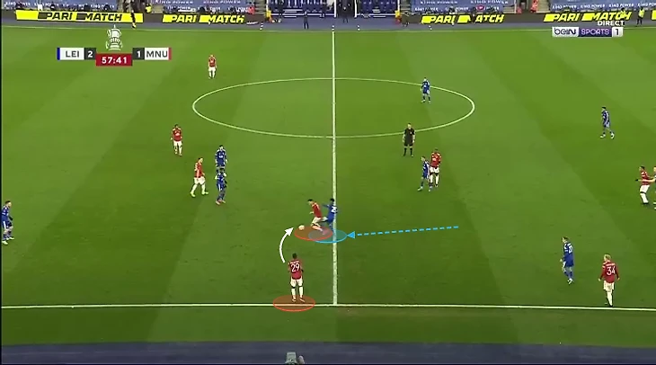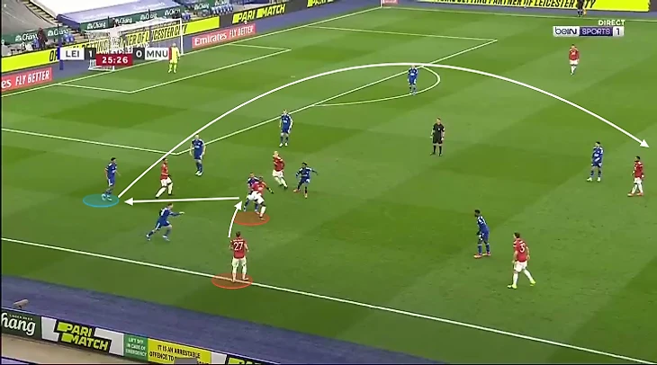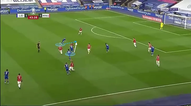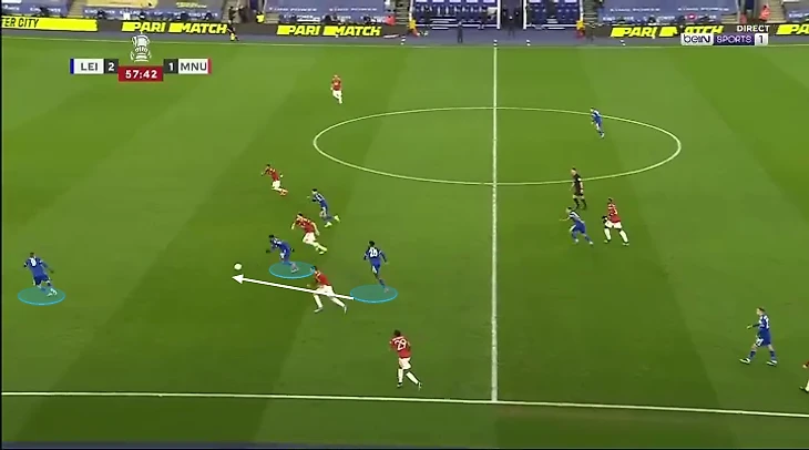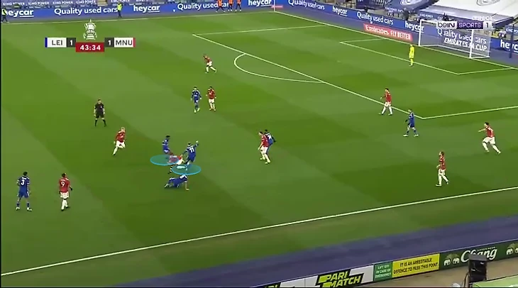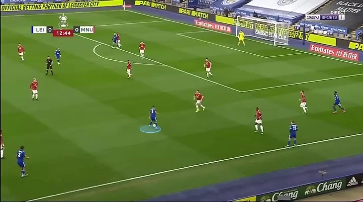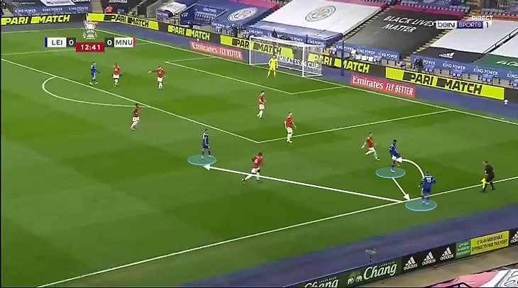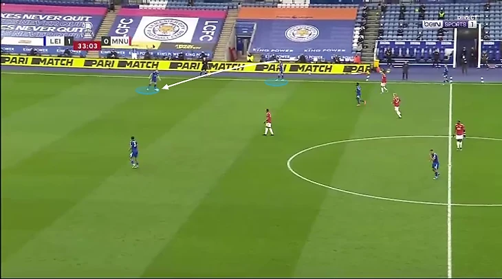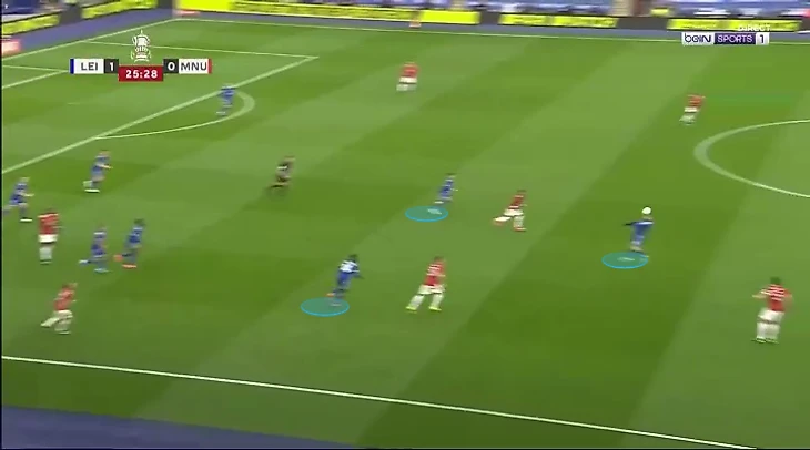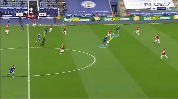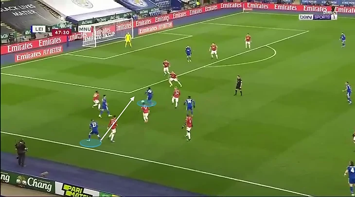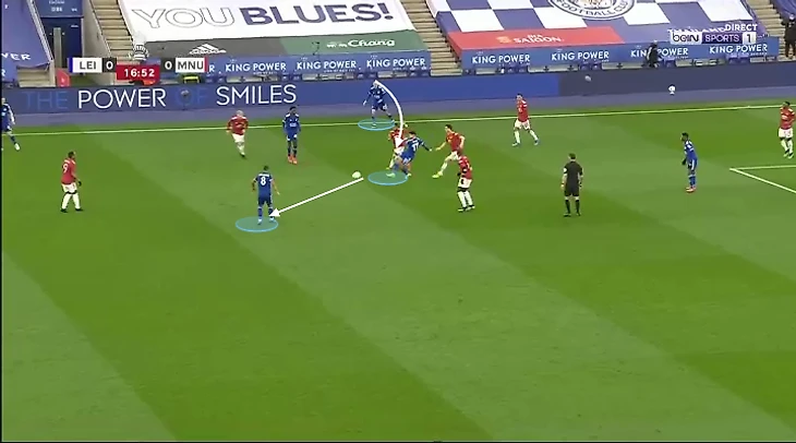 В других случаях «Лестеру» удавалось довольно легко отдавать Тилемансу, их главному созидателю. Здесь Олбрайтон играет в стеночку с Ихеаначо, и катит на бельгийца, который владеет мячом без какого-либо давления. Если посмотреть на позиции игроков, то это единственное, что «Лестер» мог сделать в этой ситуации, а «Манчестер Юнайтед» просто не проявил желания закрыть очевидные передачи.