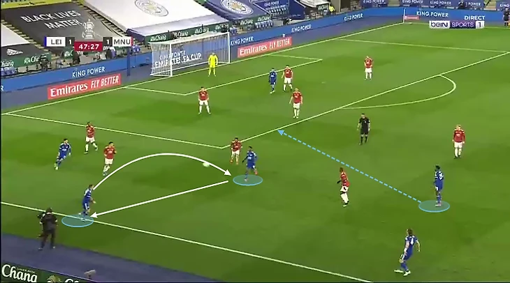 Когда «Юнайтед» толпился вокруг игрока, выполняющего вбрасывание, и вероятных получателей, «Лестер» обычно переводил мяч из угла на раз-два. Здесь Сёйнджу бросает мяч Пересу, получает обратно и перебрасывает его Олбрайтону на противоположный фланг.
