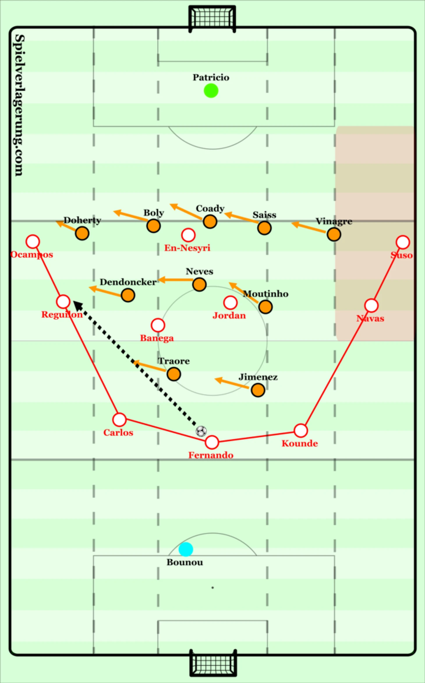 С мячом эти условия проявляются в том, что «Севилья» атакует исключительно флангами, а Хесуса подталкивает вперед движение партнеров. Часто для розыгрыша в команде Лопетеги опускается полузащитник – раньше либо Эвер Банега, либо Фернандо. За счет этого Навас спокойно поднимается – фактически становясь латералем. Схематически это выглядит примерно так:
