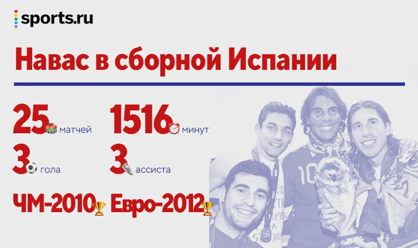 Опека лучшего друга раскрепостила Наваса. В ЮАР он отыграл 29 минут против Швейцарии, полностью отбегал игру с Гондурасом, но главное – вышел в финале. Висенте Дель Боске бросил выносливого бегунка на 60-й минуте и не прогадал: в экстра-таймах у Наваса хватило сил для мощного рывка на фланге – он протащил мяч мимо нескольких голландцев и запустил решающую атаку с золотым голом Андреса Иньесты на 116-й минуте.