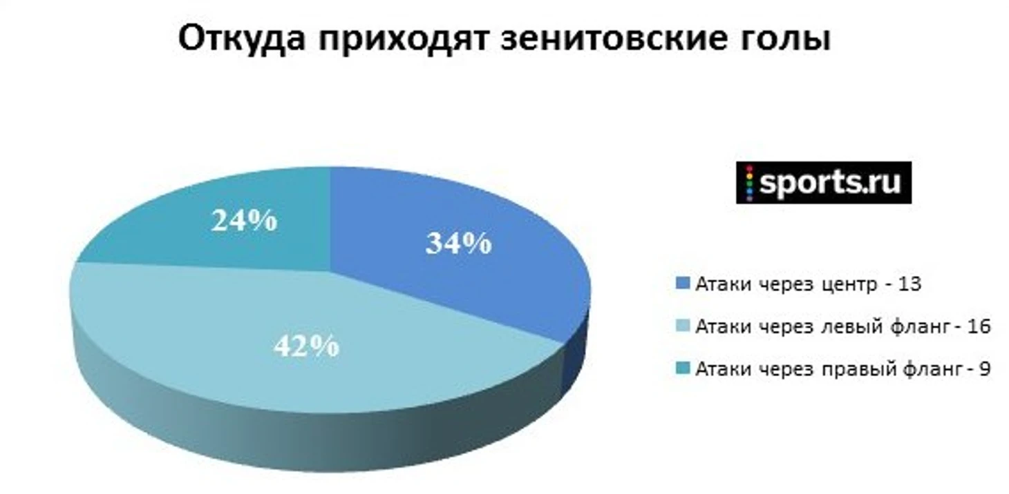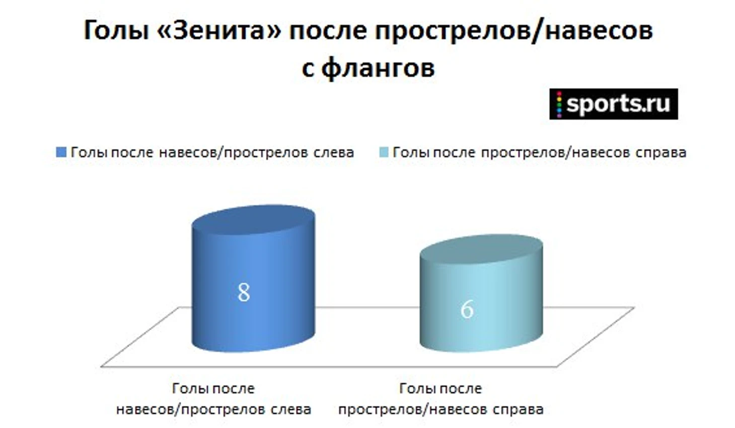 Несмотря на то, что левофланговые игроки «Зенита» (в первую очередь Кришито и Жирков) приняли участие в немалом количестве голевых комбинаций, разрыв между мячами, забитыми через левый фланг и противоположный край совсем небольшой. Более того, Жирков не сделал ни одной голевой передачи в виде навеса/прострела со своего фланга. Показатели Кришито лучше - два очка за результативность (пасы на Кокорина в игре с АЗ и на Жиркова в матче против ЦСКА).