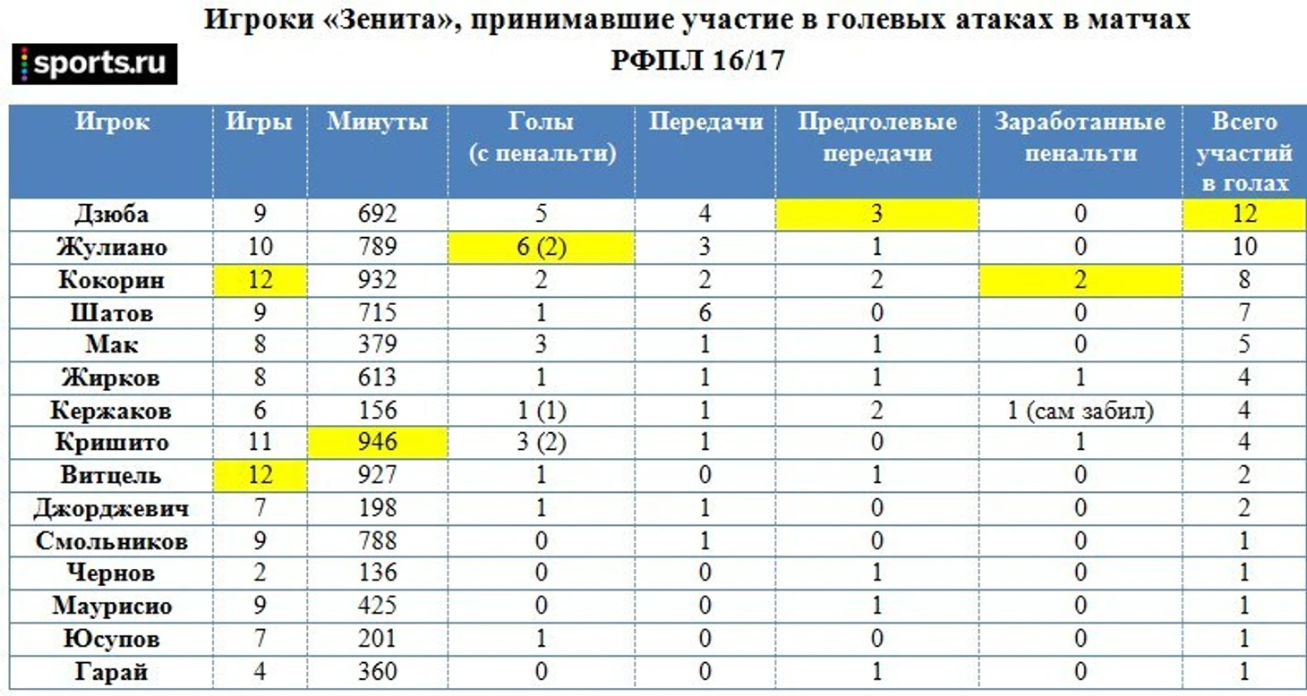Артем Дзюба опережает Жулиано по количеству участий в голевых атаках питерцев лишь за счет предголевых передач, которых у центрфорварда накопилось трое. Из этих ассистов особо стоит выделить пас пяткой на Кокорина в игре с «Урала» (атака завершилась результативным ударом Юсупова) и передачу на 9-го номера петербуржцев матче против «Оренбурга», которая во многом позволила «Зениту» организовать быструю контратаку после подачи углового гостями «Петровского». Третья предголевая передача Дзюбы – в матче с «Рубином» на Смольникова, была не так важна, Артем просто подключил к атаке крайнего защитника.