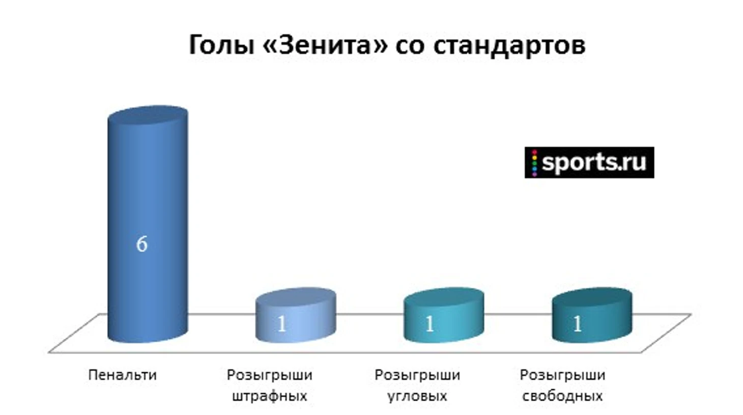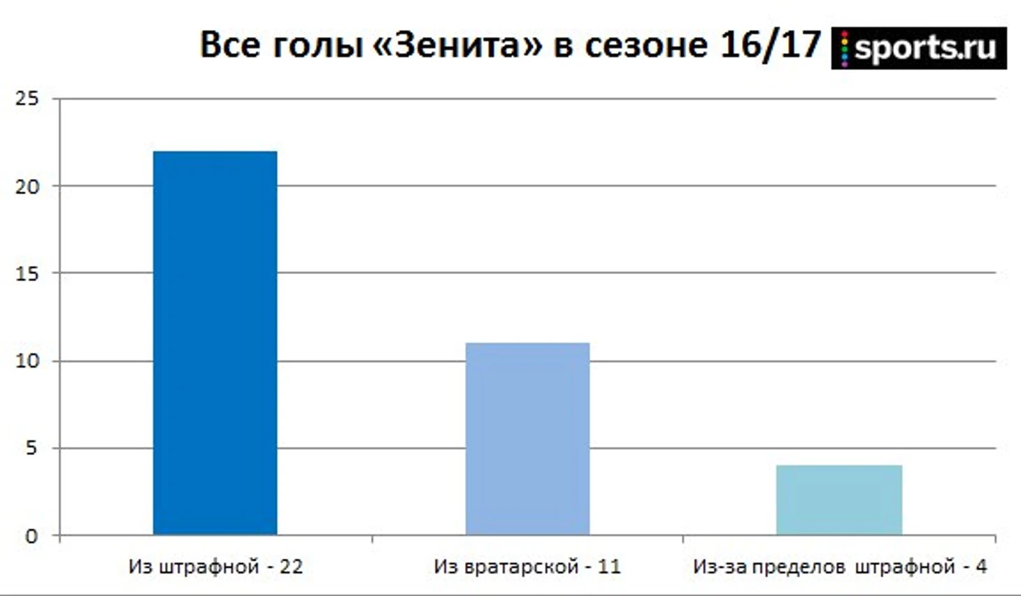 Из вратарской зенитовцы забили в два раза меньше, чем из штрафной, однако как минимум в трех случаях Жулиано бил на границе линии вратарской («Маккаби», АЗ, «Дандолк» в гостях). Особенно у чужих ворот преуспел Дзюба – четыре мяча, у Жулиано, Кокорина и Джорджевича – по два точных удара.