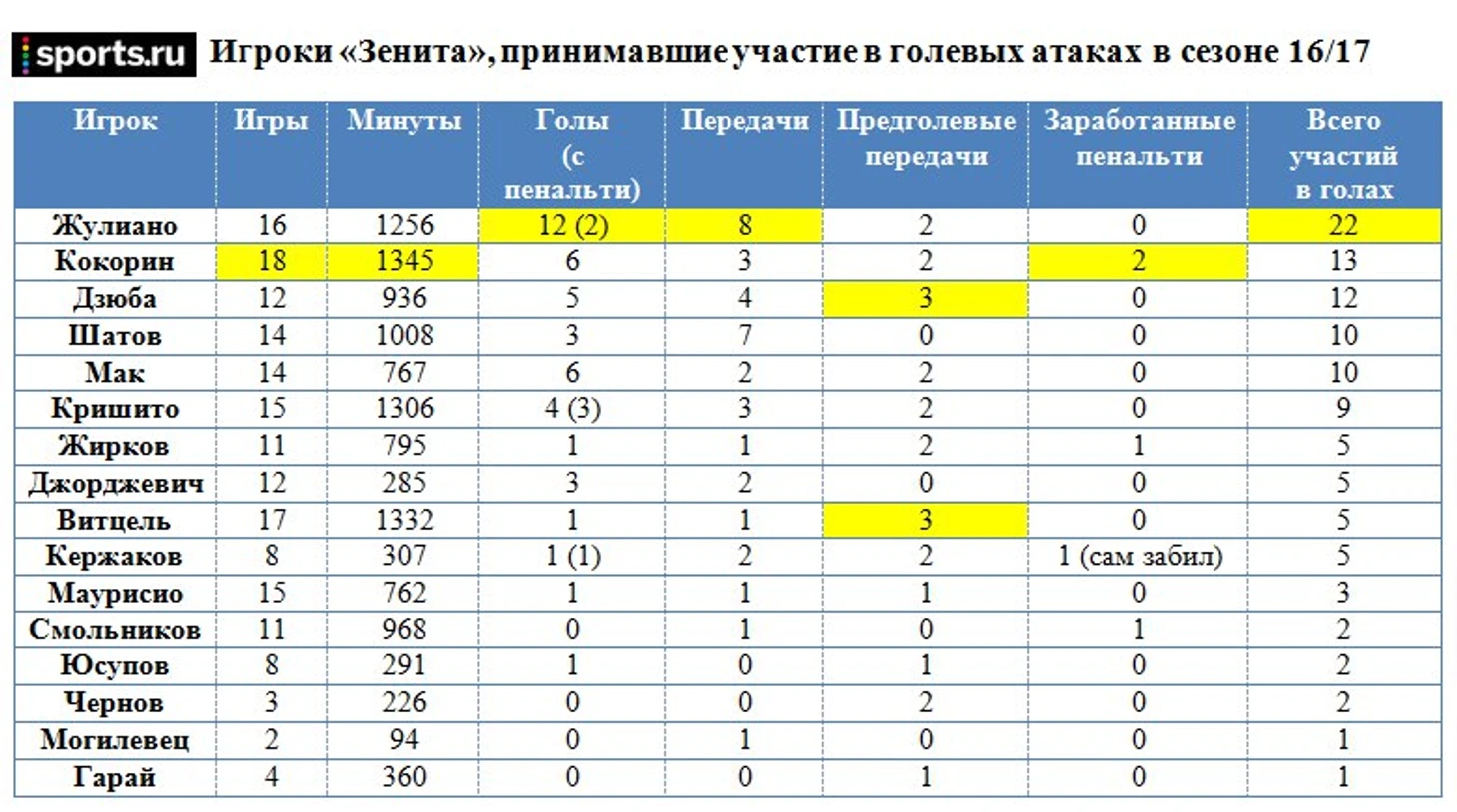 Высокое место Жулиано не должно никого не удивлять, а вот третья позиция Александра Кокорина дает немалый повод для оптимизма в разрезе дальнейшей карьеры вернувшегося в сборную форварда. Кокорин в чемпионате забивает нечасто («Арсеналу» и «Томи»), но одинаково конкурентноспособен во всех ипостасях развития атаки.