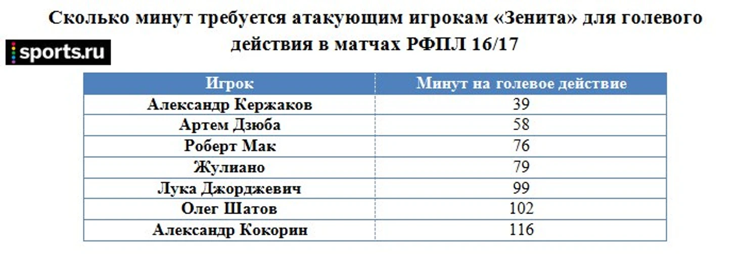 Очевидно, что количество голевых действий каждого футболиста напрямую зависит от его игрового времени. Жулиано проводит практически все матчи без замен с июля, Дзюба пропустил начало сезона из-за травмы, а Джорджевич и вовсе появляется исключительно на замену. Кто из игроков атакующей группы «Зенита» наиболее эффективно пользуется предоставленными тренером минутами?
