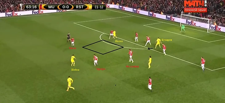 В первой встрече ростовчане оказались не готовы к зеркальному отражению их схемы соперником, от чего до перерыва команда Бердыева совсем не тревожила Ромеро. На «Олд Траффорд» в первом тайме «Ростов» также был пассивен в атаке (единственный удар на 45-й минуте нанес Ерохин), но причины отсутствия контригры серьезно отличались от того, что было в прошлый четверг.