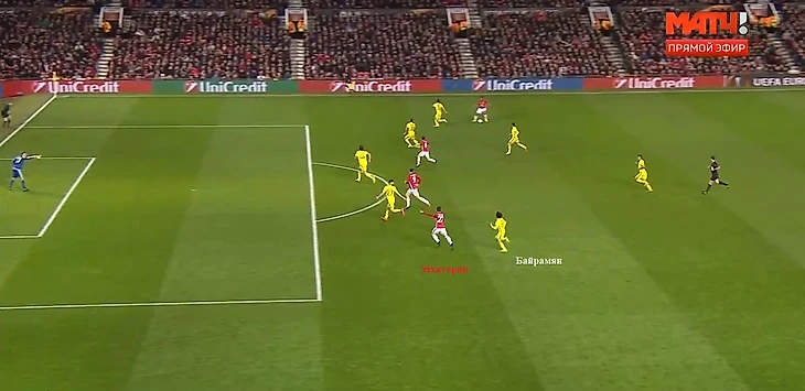В момент начала атаки «Ман Юнайтед» Байрамян и Мхитарян находились на одной линии, но по мере приближения Валенсии с мячом к штрафной «Ростова» Генрих с каждым шагом отрывался от защитника гостей. В этом эпизоде подачу Валенсии замкнул Ибрагимович, но если бы мяч перелетел через шведа Мхитарян расстреливал бы Медведева без помех.