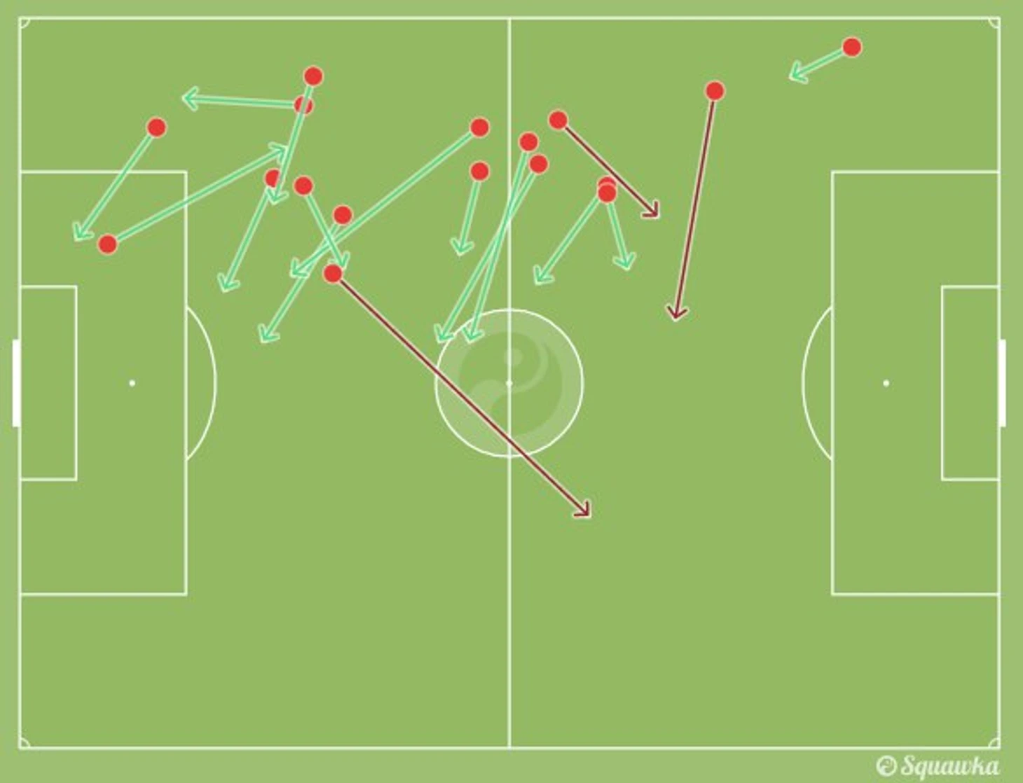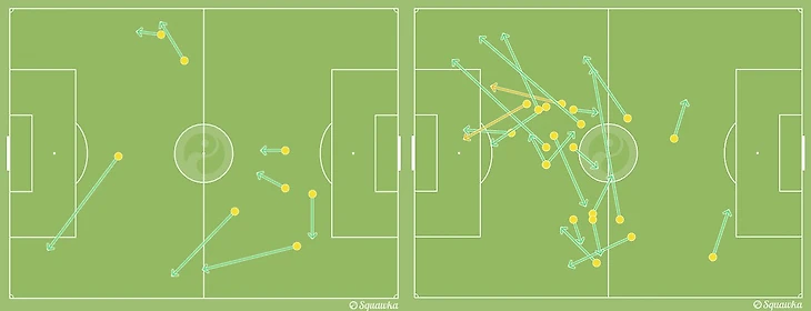 Карта точных передач Нобоа в матче с «МЮ». Слева – пасы в первом тайме, справа – после перерыва. Зеленым цветом отмечены простые передачи, желтым – закончившиеся ударом по воротам Ромеро.