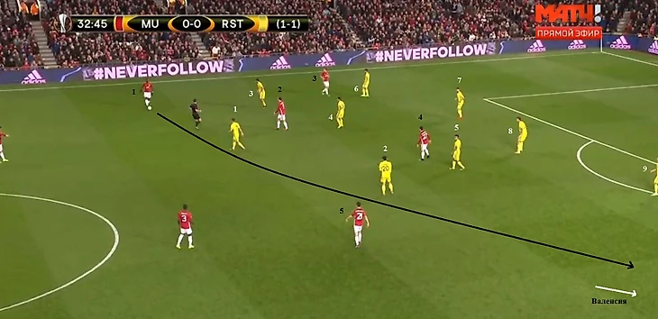 Хозяева растягивали оборону «Ростова» за счет перемещения очень большой группы игроков ближе к левому флангу (когда мяч находился там) и последующей длинной передачи на Валенсию. Ключевой фигурой для диагоналей у «Ман Юнайтед» в первом тайме был Поль Погба – 8 передач на правого латераля.